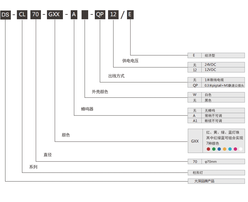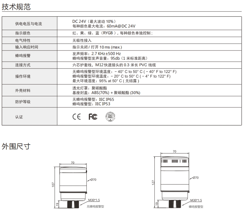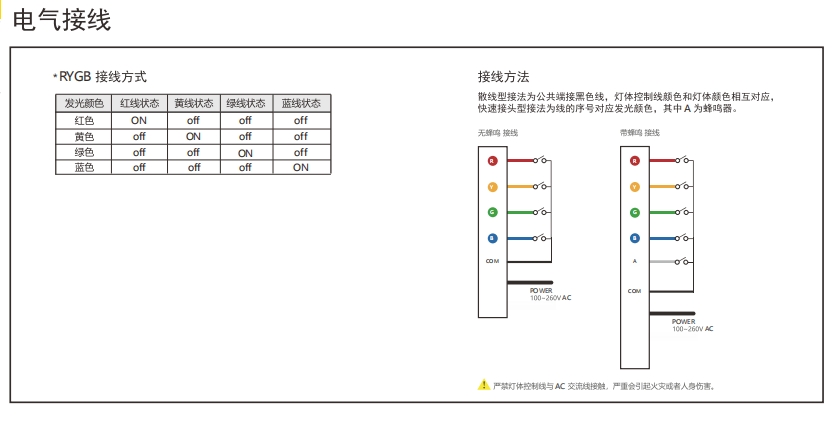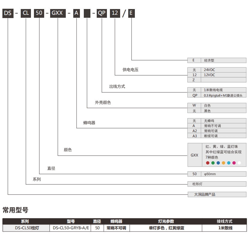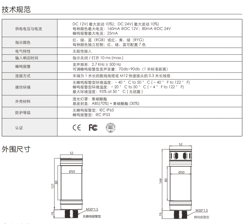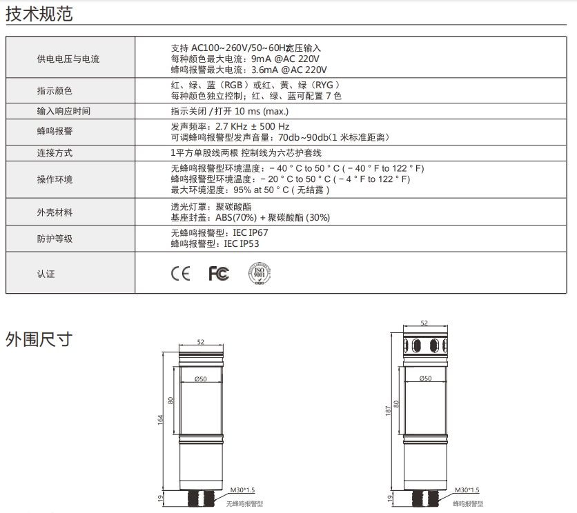 CL50系列指示柱灯,配备一段式多色发光,覆盖红、黄、绿、蓝四色发光,确保了广阔的发光面积和高可视度,提供宽广的发光面积与高可视度,双层灯罩设计提升防护等级,确保坚固耐用性,支持AC100~260V宽压输入。