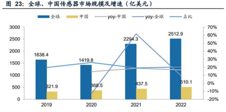 2019-2022年,全球传感器市场规模超万亿人民币,中国占比仅约20%,且市场增速相对稳定,上升空间大,国产替代需求极高;